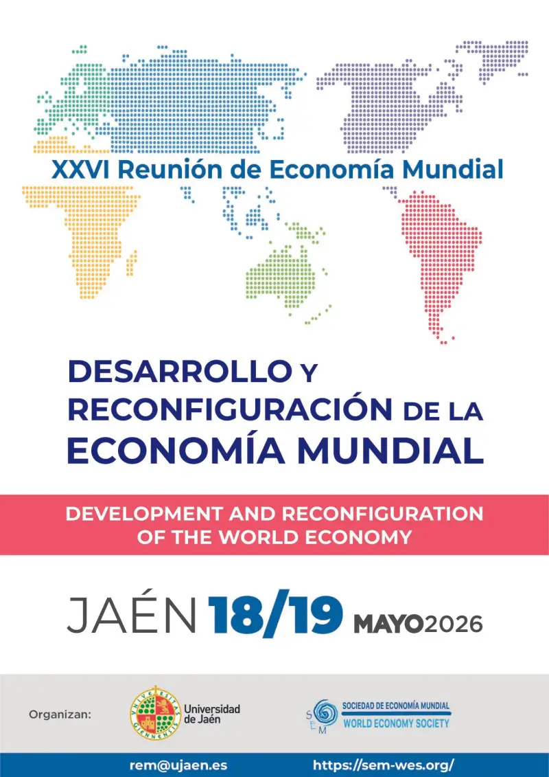 La Sociedad de Economía Mundial (SEM) y el Departamento de Economía de la Universidad de Jaén organizan la XXVI Reunión de Economía Mundial bajo la temática “Desarrollo y Reconfiguración de la Economía Mundial”, que se celebrará los días 18 y 19 de mayo de 2026 en Jaén.